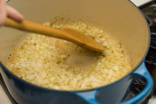 To start the soup, melt butter over medium heat and add rosemary and red pepper flakes. Cook for 2 minutes, Add onion, cook until onions are translucent.